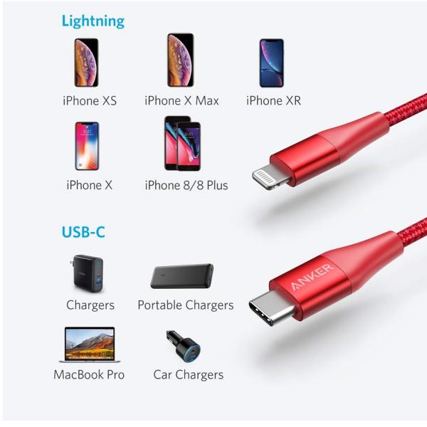 - كابل باور لاين II لايتننج الى يو اس بي- سي من انكر ، 1.8م\6قدم متر- احمر