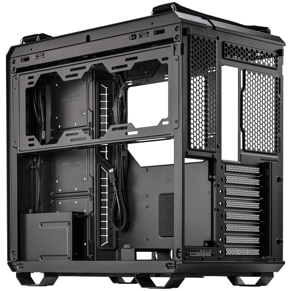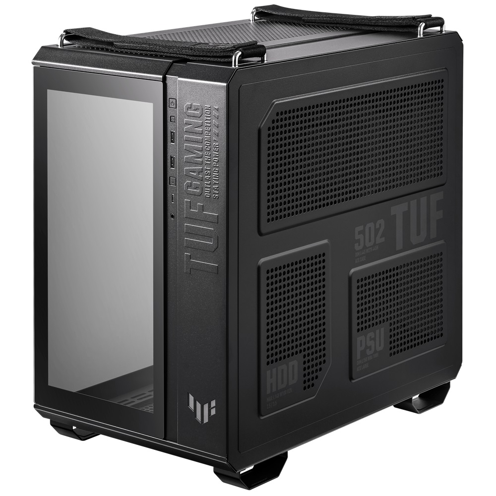 تواصل اللوحة TUF Gaming GT502 تحسينات البناء الخاصة بها من خلال اللوحات الجانبية التي يمكن إزالتها ببساطة عن طريق الضغط على زر مخفي في الجزء الخلفي من الهيكل.