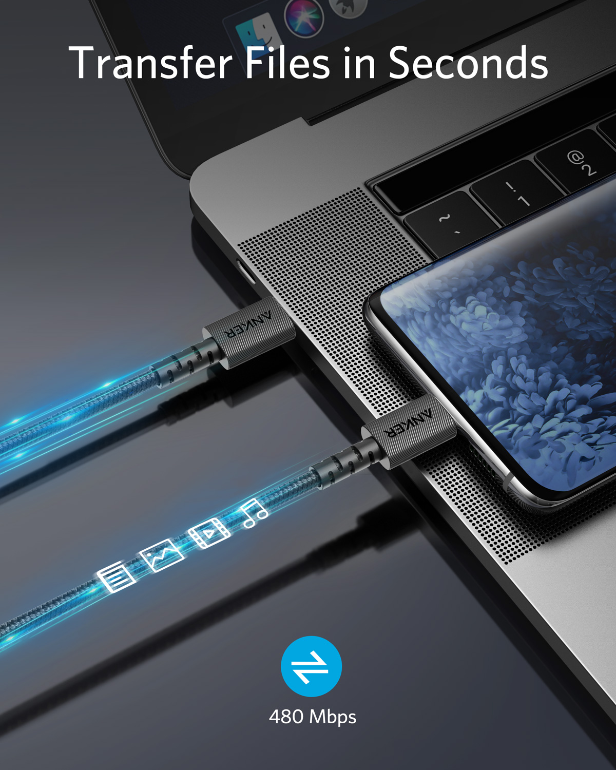 أنكر باور لاين سيليكت + USB-C إلى USB-C (1.8 م/6 قدم) - أسود يشحن الهواتف والأجهزة اللوحية بمنافذ USB-C بسرعة عالية. سرعات نقل تبلغ 480 ميجابايت/ثانية، أو 100 أغنية كل 5 ثوانٍ. متوافق مع جهاز USB-C، الجزء الخارجي من النايلون المضفر المزدوج والمقوى بألياف الأراميد