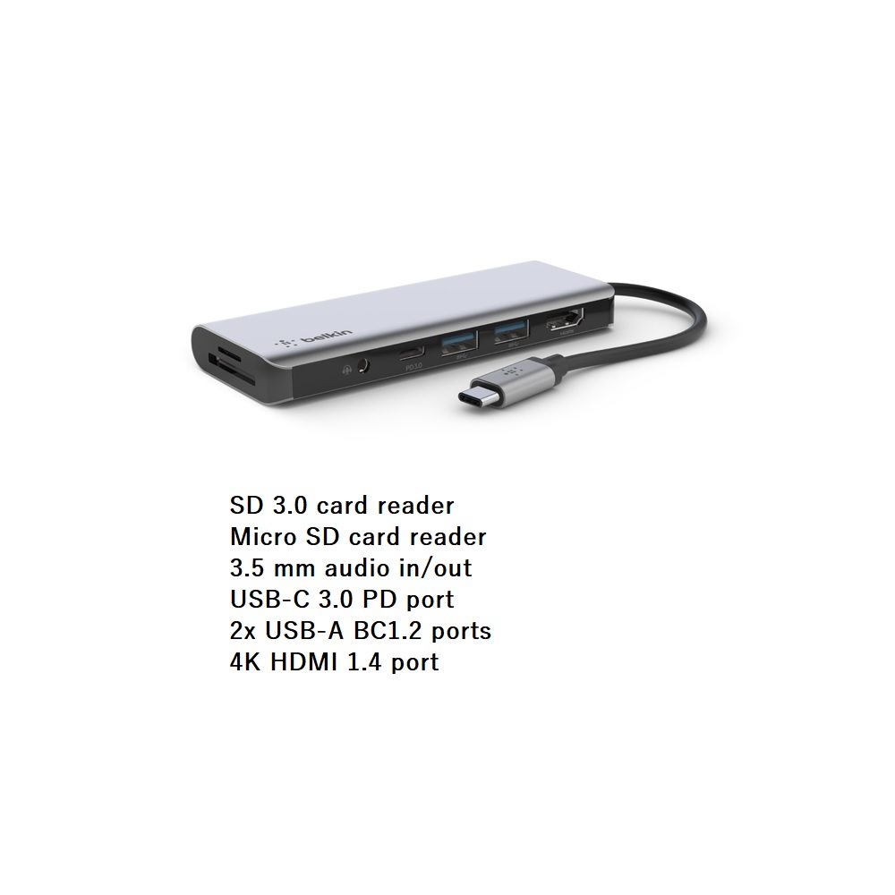 محور محول متعدد المنافذ 7 في 1 USB-C من بيلكين - 7 في 1 (AVC009) HDMI، 100 وات PD، USB 3.0، قارئ بطاقات الصوت
