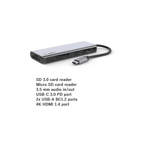 بلكين كونكت USB-C مدخل/مخرج صوت 3.5 ملم قارئ بطاقة SD 3.0 قارئ بطاقة مايكرو اس دي 3.0 2 منافذ USB-A 3.0 BC1.2 4 كيه اتش دي ام اي 1.4 منفذ USB-C PD