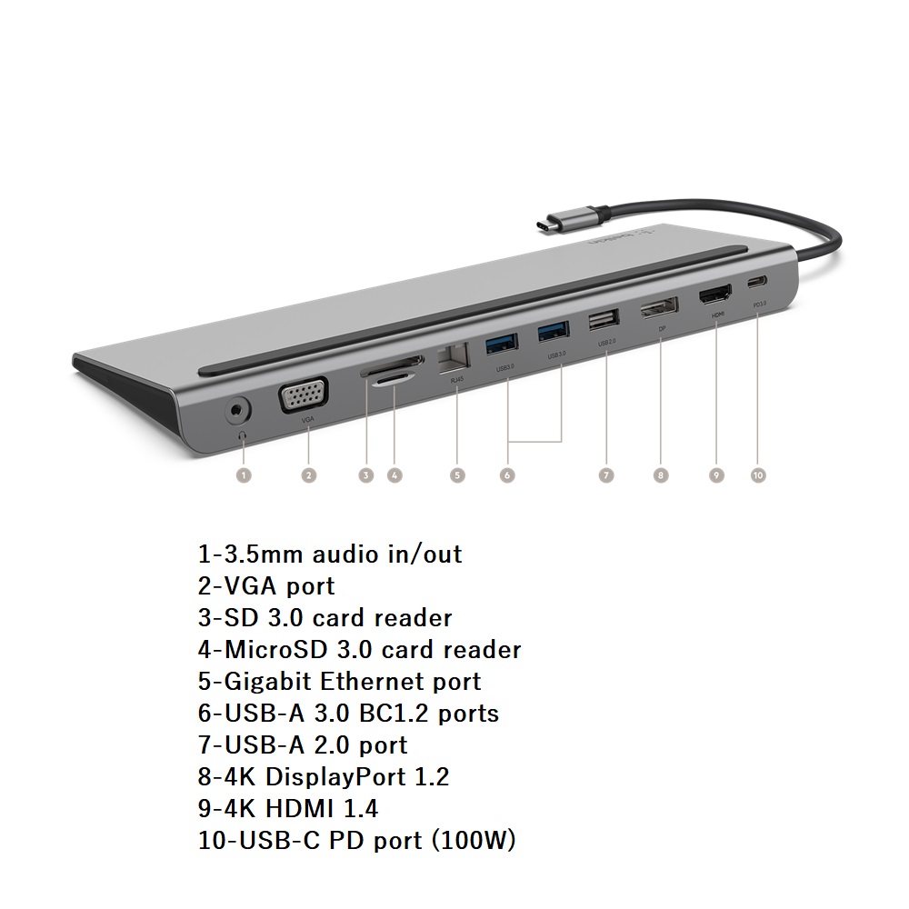 • يوسع منفذ USB-C إلى منفذ HDMI، ومنفذ DisplayPort، ومنفذ VGA، و3 منافذ USB-A، ومنفذ Gigabit Ethernet، وقارئات بطاقات SD وMicroSD، ومنفذ صوت 3.5 مم، ومنفذ USB-C PD
