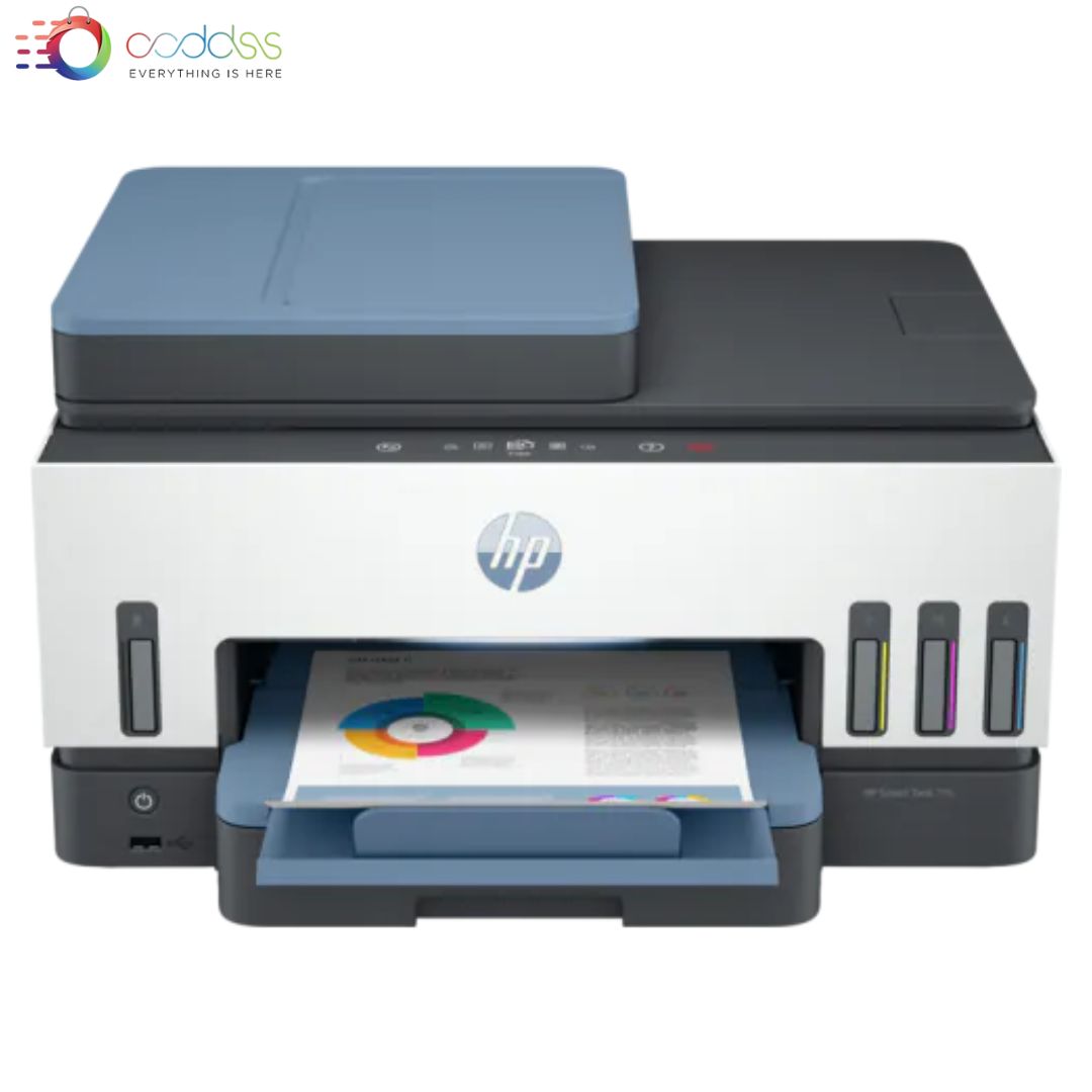 HP Smart Tank 795 All-in-One; 3 x HP GT53XL 135-ml Black Original Ink Bottle; HP GT52 Cyan Original Ink Bottle; HP GT52 Magenta Original Ink Bottle; HP GT52 Yellow Original Ink Bottle; Power cord; PHA; Setup guide; Reference guide; Ink caution flyer; Regulatory flyers; warranty flyers