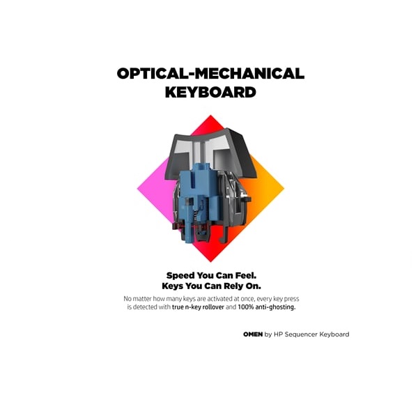 تتيح المفاتيح الزرقاء الضوئية والميكانيكية وقت استجابة 0.2 مللي ثانية - أسرع 10 مرات من المفاتيح الميكانيكية التقليدية - بالإضافة إلى عمر 70 مليون نقرة توفر المفاتيح ذات الإضاءة الخلفية الفردية ما يصل إلى 16.8 مليون لون RGB للاختيار من بينها مع تأثيرات فريدة ، وكلها قابلة للتخصيص من OMEN Command Center تحكم في الوسائط باستخدام مفاتيح مخصصة للتشغيل والإيقاف المؤقت والتخطي وكتم الصوت ، بالإضافة إلى قضيب بكرة معدني كبير الحجم لضبط مستوى الصوت