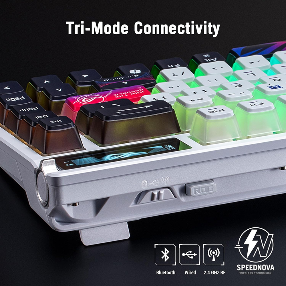- Tri-mode connection: Connect via Bluetooth® (up to three devices simultaneously), 2.4 GHz with ROG SpeedNova wireless technology, or wired USB