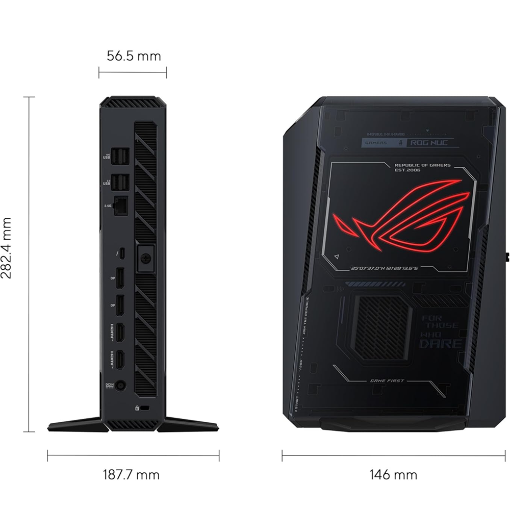 • أسوس ROG NUC (2025) ميني بي سي للألعاب NUC15JNK، بمعالج Intel Ultra 9، وكرت شاشة RTX 5070Ti سعة 16GB، وذاكرة RAM بسعة 32GB، وقرص SSD NVMe بسعة 1 تيرابايت، مع نظام التشغيل ويندوز 11، موديل RNUC15JNK9X389A2