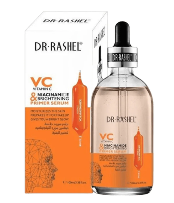 سيروم برايمر فيتامين سي ونياسيناميد ومُشرق من دكتور راشيل - 100 مل سيروم برايمر فيتامين سي غني بمضادات الأكسدة التي تُحافظ على نضارة البشرة ونعومتها. يُفتّح لون البشرة ويُوحّده، ويُقلّل من ظهور البقع الداكنة بشكل ملحوظ، بينما يُغذّي حمض الهيالورونيك البشرة، ويُعالج الجفاف والخطوط الدقيقة والتجاعيد. يُستخدم كبرايمر مُرطّب قبل وضع المكياج. طريقة الاستخدام: ضعي بضع قطرات على منتصف وجهك، ودلّكيها للخارج، كخطوة أخيرة في العناية ببشرتك قبل وضع المكياج/كريم الأساس. يُمكن استخدامه كبرايمر فعّال، أو يُمكن وضعه كعلاج موضعي للمناطق ذات المسام الواسعة. سيمنحكِ هذا بشرة مُشرقة، مُوحّدة، وناعمة.
