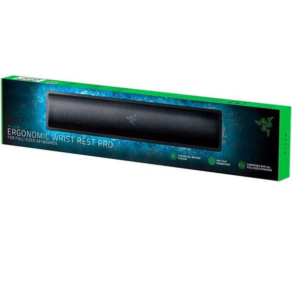The Razer Ergonomic Wrist Rest Pro For Full-sized Keyboards has a cooling gel-infused, memory foam cushion that’s wrapped in a special heat-transfer fabric, reducing heat build-up and pressure on your wrists so you stay cool and comfortable through gaming marathons.