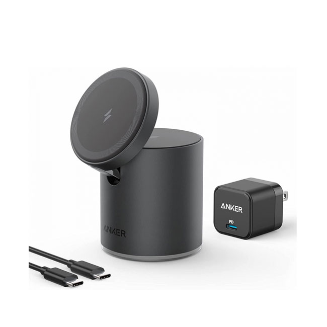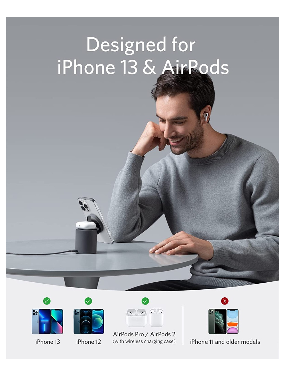Anker 2 in 1 MagGo Magnetic Wireless Charger Supports simultaneous wireless charging of your iPhone 13/12 and earbuds in a single place. Time to get rid of those messy cables.Flip up the phone-charging platform to a maximum range of 60° and attach your iPhone horizontally or vertically for perfect viewing pleasure.Save valuable space with a versatile magnetic charging station that can quickly power up your iPhone and earbuds and is 40% smaller than a soda can.The non-slip base keeps the charging station in place and prevents sliding when charging. It also features a sleep-friendly LED indicator that shows you the charging status.