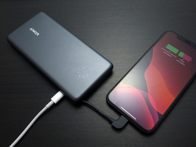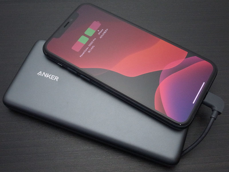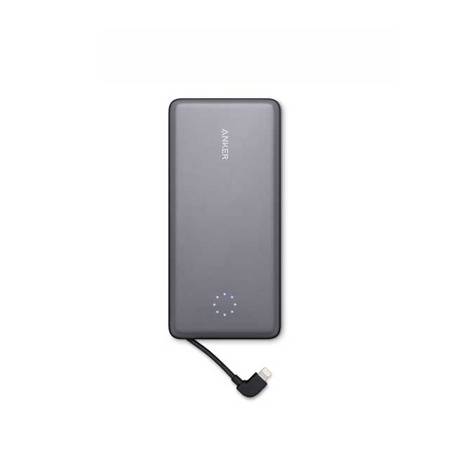 Anker PowerCore+ 10000 Pro More than 46 hours of battery life Built-in Lightning cable and Lightning input Listen to music through the Lightning port while charging Free PowerCore+ app ensures you get future firmware updates for ongoing optimal performance Simultaneously recharge PowerCore battery and your iPhone Check PowerCore battery level on iPhone lock screen Sync data while charging