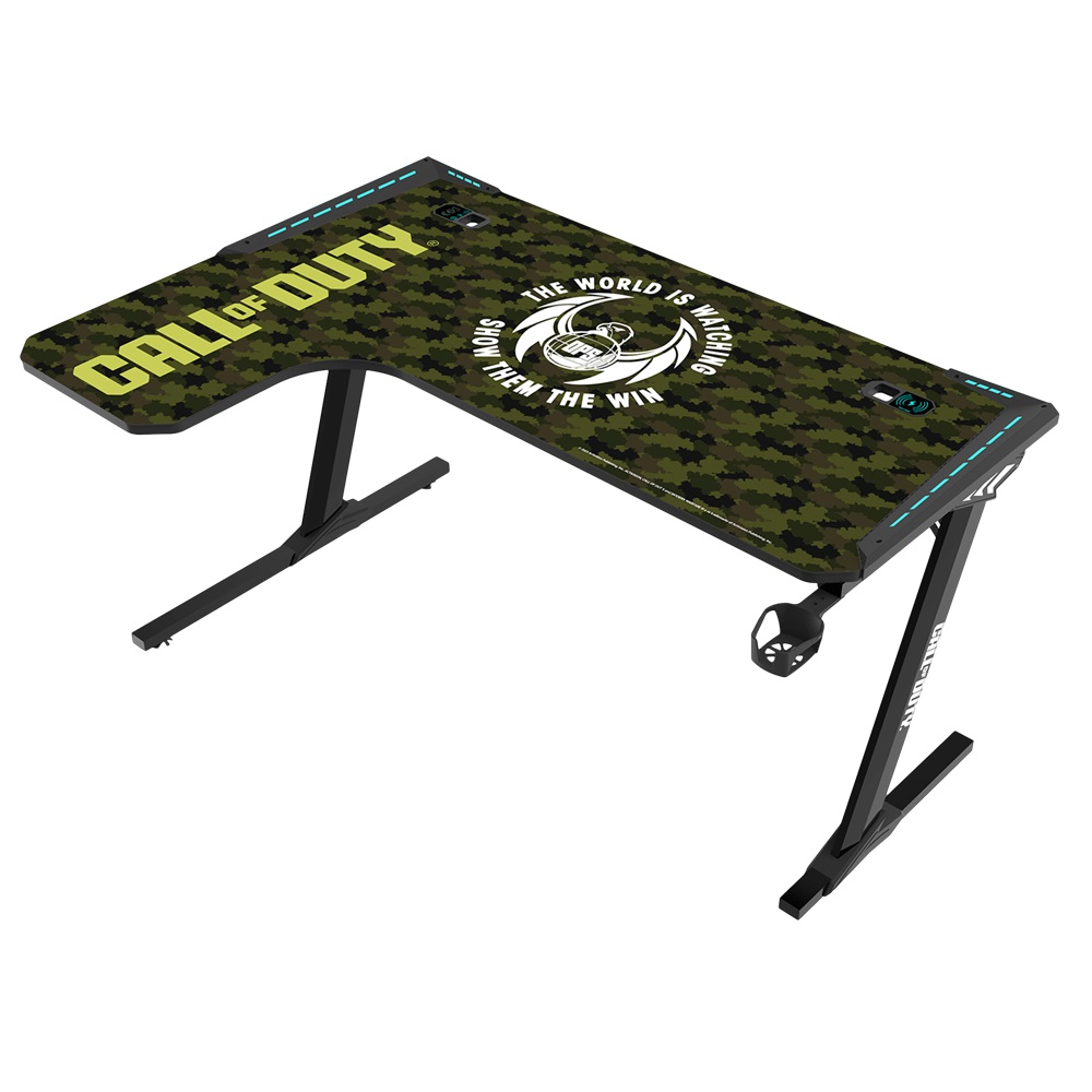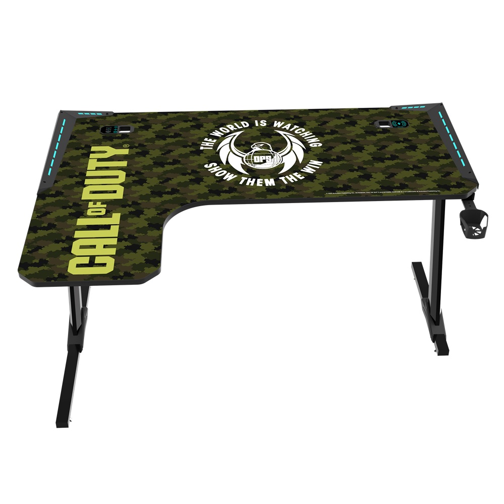 This COD inspired gaming desk is provided with a built-in power strip with USB Ports, and Charging points which can easily charge smart phones, computer, tablet, notebook or gaming gears and provide power for multiple devices. With cup holder, headset hook, and LED control panel, this is a perfect desk for any gaming setup.