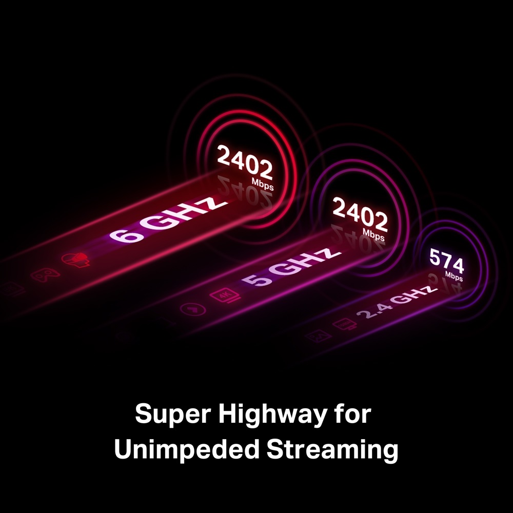 - Unparalleled Tri-Band Speed — Boost your overall speeds up to 2402 Mbps (6 GHz) + 2402 Mbps (5 GHz) + 574 Mbps (2.4 GHz)