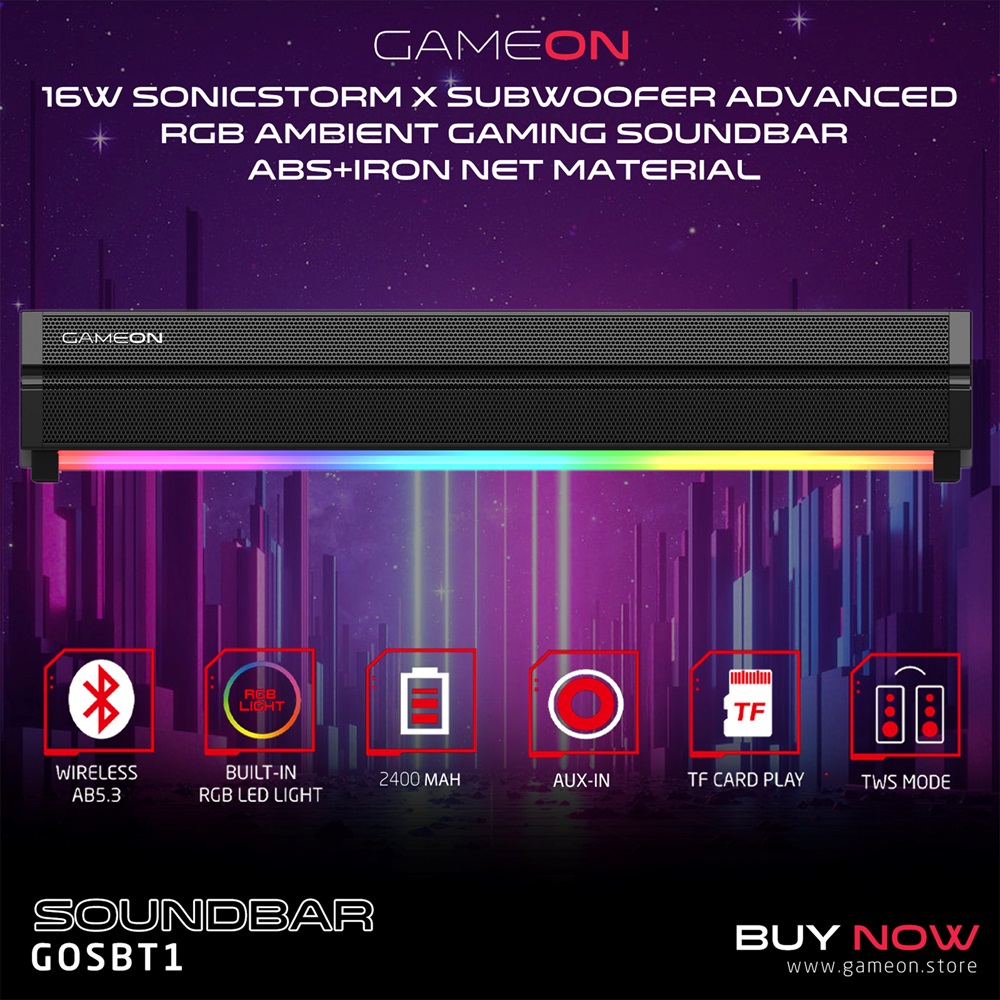 - GameOn Sonicstorm X Wireless RGB Gaming Soundbar – Black