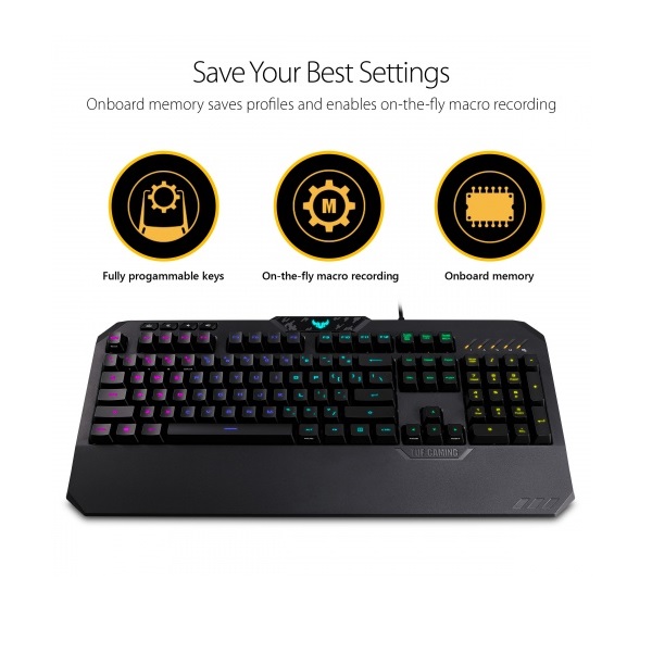 TUF Gaming Combo Box features the TUF Gaming Keyboard and Mouse Gaming Keyboard – mechanical membrane (mech-brane) switches Gaming Mouse – precision movement and aim ASUS Aura Sync RGB lighting features a nearly endless spectrum of colors ROG Armoury II software for easy customization