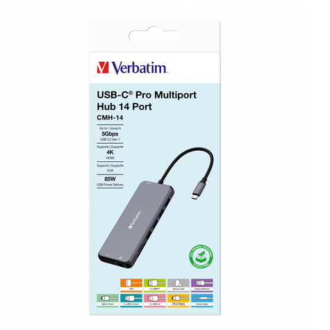 - Verbatim 32154 14 Port USB-C Pro Multiport Hub, Dual HDMI, VGA, Card Reader, CMH-14