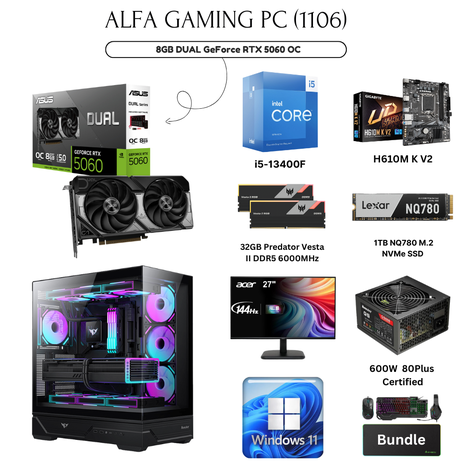Alfa Gaming PC 1105 Intel Core i5-13400F Processor Lexar 1TB NV2 M.2 NVMe SSD, 6500MB/s ASUS 8GB DUAL GeForce RTX 5060 OC Edition VGA Acer 27″ EK271 P6 144Hz 1ms Speaker FHD IPS Monitor Huntkey MVP Destiny Mid Tower PC Case – Black, 4 Fans Acer 32GB Predator Vesta II DDR5 6000MHz RAM, (16GB x2) Sharx JS4X1 4 in 1 Gaming RGB Combo Bundle, Keyboard, Mouse, Headset, Mouse Pad USB WiFi 5G / Win11Pro
