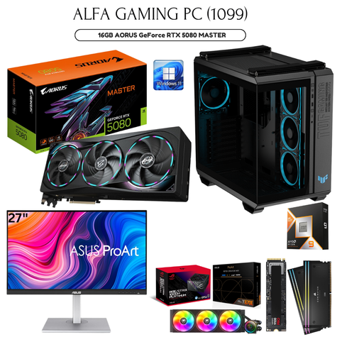 - Alfa Gaming PC 1099 AMD 9900X3D, 16GB RTX5080, 96GB RAM, 2TB SSD, ASUS 27″ ProArt, ASUS TUF GT502, W11Pro