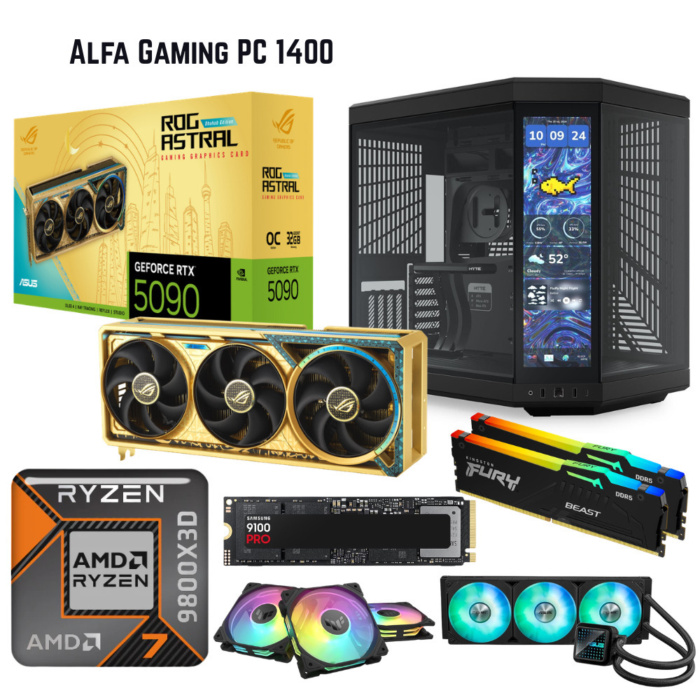 - Alfa Gaming PC 1400, AMD Ryzen 7 9800X3D, 32GB RTX5090 ROG Astral Dhahab, 64GB RAM, 1TB NVME, HYTE Y70 Touch, W11Pro