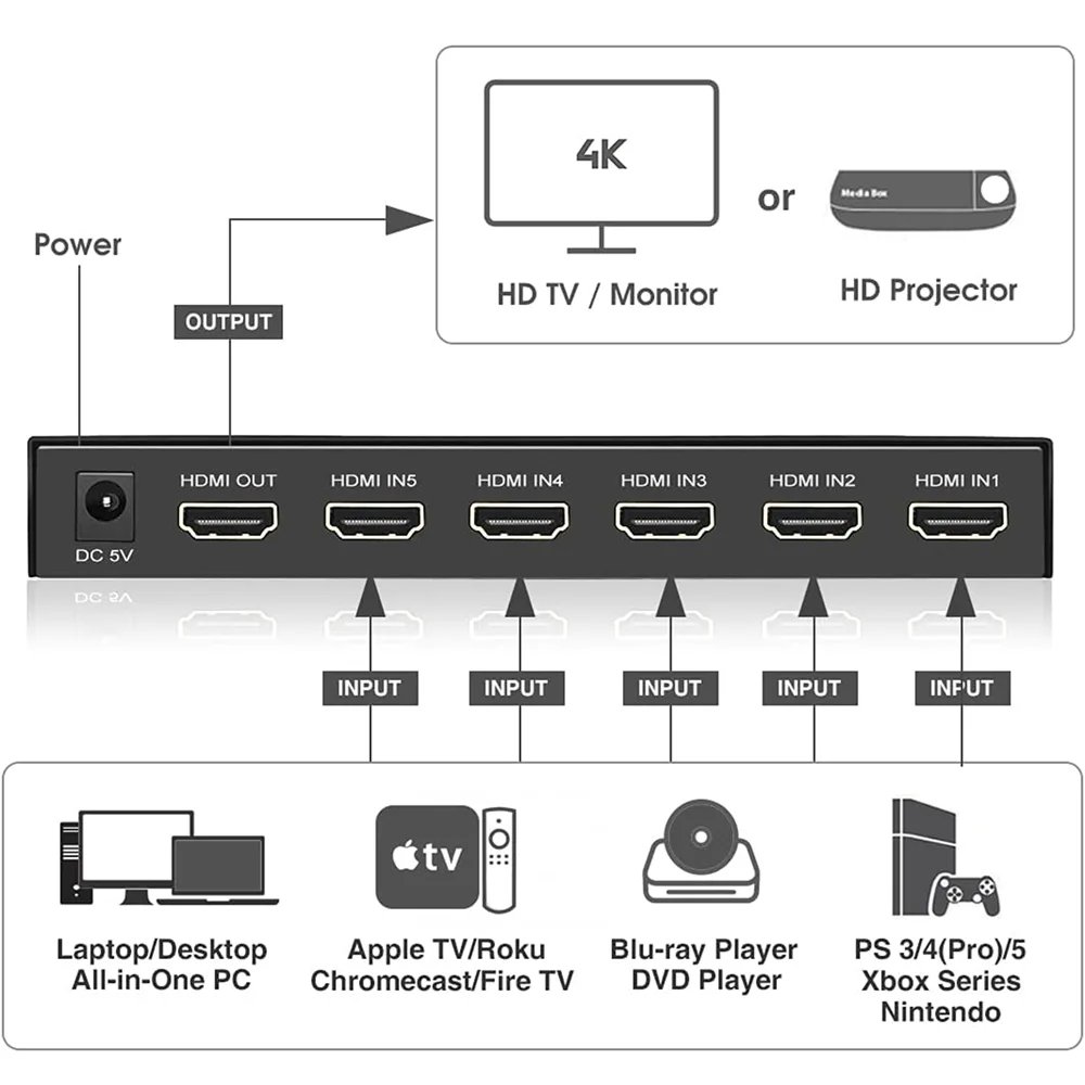 - Jasoz G154 HDMI Switch 5-Port 4K@60Hz 5 in1 Out Switcher