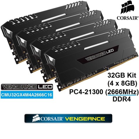 - Corsair 32GB 2666MHz DDR4 RAM Vengeance Memory Kit, 4x8GB